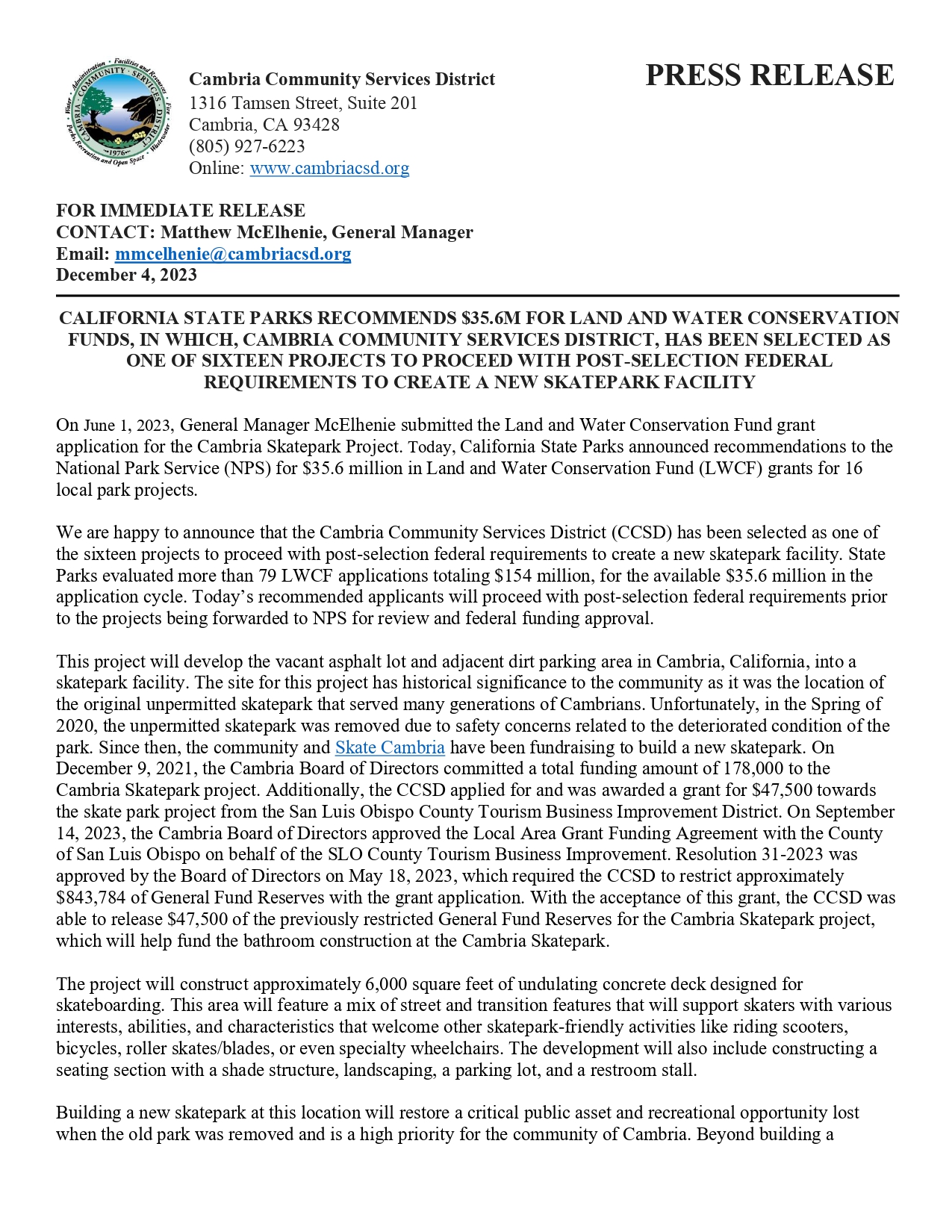 From: Cambria Community Services District